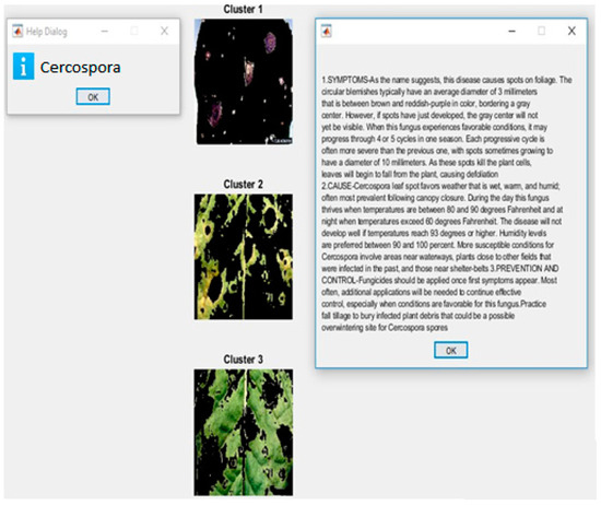 The result after applying CNN is shown in Figure 11. It also displays the symptoms, causes, and the methods to control the occurrence of the detected disease cercospora. The severity and extent of the disease we reassessed using the number of pixels present in disease-affected ROI expressed in Equation (5):