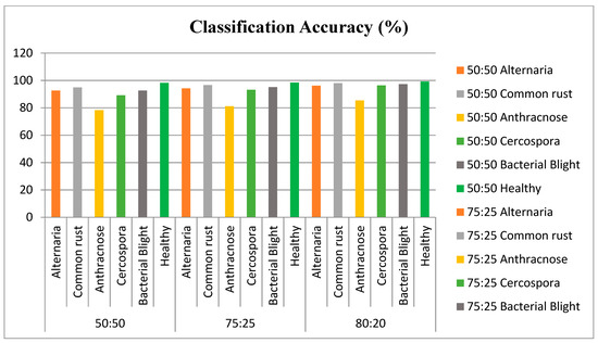 The proposed approach was tested with varying number of synthesized data. In the analysis, 70% of the existing images were used for training the algorithm and 30% were used for evaluating the model. Based on the results, the model was retrained by varying the multiple parameters for multiple epochs. Figure 13 depicts the accuracy of classification with different original vs. synthesized samples. Figure 14 illustrates the results of the disease-wise classification for five different diseases—viz., Alternaria, common rust, Anthracnose, Cercospora, and bacterial blight in different combinations of original vs. synthesized samples. To analyze the performance of the proposed approach, SVM classifier, ELM, and CNN were implemented and experimented using the proposed training dataset with 20% of synthesized data, and the results are presented in Figure 15, where it can be observed that in comparison with other algorithms, the proposed model yielded better classification results.