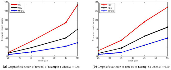 Two numerical problems are performed to test the viability of the proposed schemes in solving 2D hyperbolic telegraph differential Equation (2). The numerical tests are run on a PC with a Core 2 Duo 2.8 GHz processor and 2GB of RAM Windows XP SP3 with Cygwin C in Mathematica 11 software. We assume that the step sizes in both x and y directions are the same, i.e., in both numerical experiments. Throughout our numerical calculations, we employed the Gauss Seidel method with a relaxation factor of equal to 1. The norm was utilized for the convergence criterion, with a tolerance factor of . Various mesh sizes of 20, 30, 40 and 50 were considered for different time steps of 1/20, 1/30, 1/40 and 1/50 in Example 1 and mesh sizes of 25, 35, 45 and 55 were considered for different time steps of 1/25, 1/35, 1/45 and 1/55 in Example 2. The numerical results in Table 1 and Table 2 are obtained using the FSP, FEG, and MFEG iterative methods in terms of elapsed time (in seconds), number of iterations, average absolute error, and maximum absolute error. The fractional standard point (FSP) and fractional explicit group (FEG) iterative schemes are derived in [6] for 2D fractional telegraph equation. Graphs of execution time and iteration count are illustrated in Figure 1 and Figure 2 at various values of for Example 1 and Example 2.