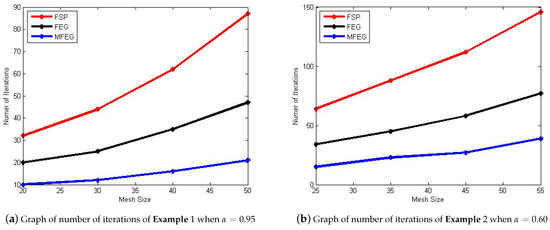 The ranges of percentages of MFEG method against FSP and FEG methods in terms of execution time and number of iterations of Example 1 at and Example 2 at are summarized in Table 7 and Table 8, respectively.