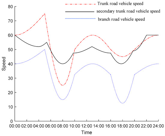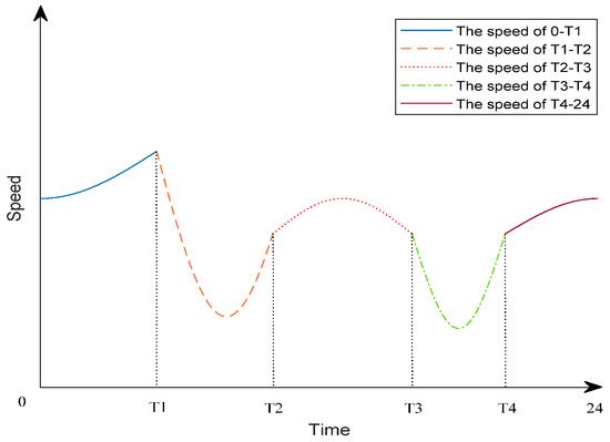 According to relevant data in [22], the all-day variation trend of vehicle speed is shown in Figure 1. In Figure 1, one day is divided into five different time periods. A trig function is used to represent the variation trend of vehicle speed in each time period. The variation trend of each time period is different, which is basically consistent with the actual transportation situation.