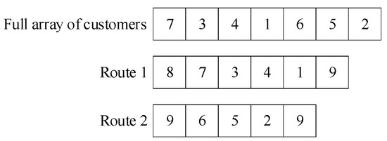 Figure 2 is taken as an example to illustrate the decoding of a chromosome. The customer arrangement (chromosome) has been generated as , and the first vehicle is sent from the depot to provide service. When the vehicle reaches customer 1, it cannot serve subsequent customers due to the payload constraint. The second vehicle is sent to serve subsequent customers and so on until the last customer has been served. The starting and ending depots are determined for each route, and depots are represented by numbers 8 and 9. The starting and ending depots for vehicle 1 are 8 and 9, and the starting and ending depots for vehicle 2 are both 9.