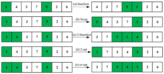 Variable neighborhood search strategy has strong search ability. Crossover and mutation operations in traditional genetic algorithms are replaced by variable neighborhood search strategy, which can increase the performance of the algorithm. Variable neighborhood search strategy: neighborhood structure , the first neighborhood structure starts to search to chromosomes . If the improved solution is not found within the search times, the next neighborhood structure will continue to search; Otherwise, , and the first neighborhood structure is searched again. In this paper, five neighborhood structures are adopted, namely, insertion, swap, 2-insertion, 2-opt and or-opt.