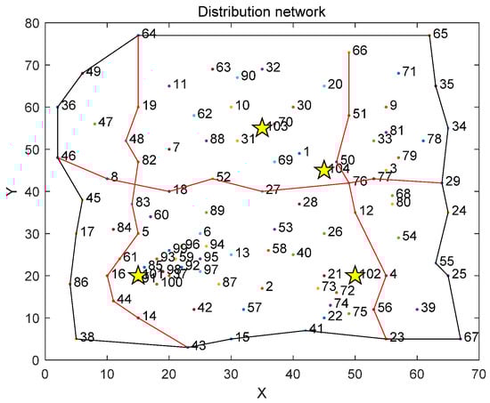 Roads in the distribution area road network are divided into three types, namely trunk road, secondary trunk road and branch road, as shown in Figure 5, which the red line represents trunk road, the black line represents secondary trunk road, and nodes not connected by lines are in the branch road. The yellow stars in Figure 5 represent depots. Figure 6 shows the speed changes of different types of roads. The red line represents the vehicle speed of trunk roads, the black line represents the vehicle speed of secondary trunk roads, and the blue line represents the vehicle speed of branch roads. Table 4 shows the results of HGAVNS for MDJDVRP-TDN instances for 10 times, which represents the total distribution cost, represents the best solution, represents the average solution, represents the worst solution, CPU represents the running time, %Dev represents the deviation between the solution of each time and the best solution. The optimal distribution scheme is given in Table 5, which is the distribution route of each vehicle.