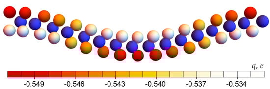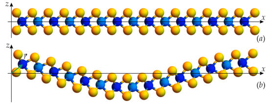 In addition to the position of the atoms, the Bader charges [] were computed. The distribution of the charges appeared to be uniform in a flat system and equal to for molybdenum atoms and is for sulfur atoms, where C is the elementary charge. For strongly curved layers with a bending of 8–10%, a harmonic dependence of the charges on the x coordinate was observed (as shown in Figure 3). However, the difference between the maximal and minimal charges appeared to be small (see the scale in Figure 3) and close to the magnitude of expected numerical error. The effect of such a distribution on the electrophysical parameters of the layer is neglected hereinafter. This means that we neglect the terms proportional to the deformation potential in Equation (1), as the first approximation, and extract the terms proportional to the net flexoelectric coefficient, , from the DFT results. The charge variations can be found as the second approximation, which becomes important for large curvatures only [].