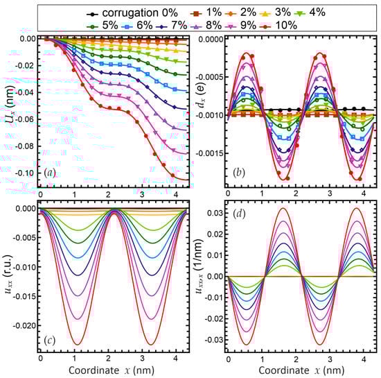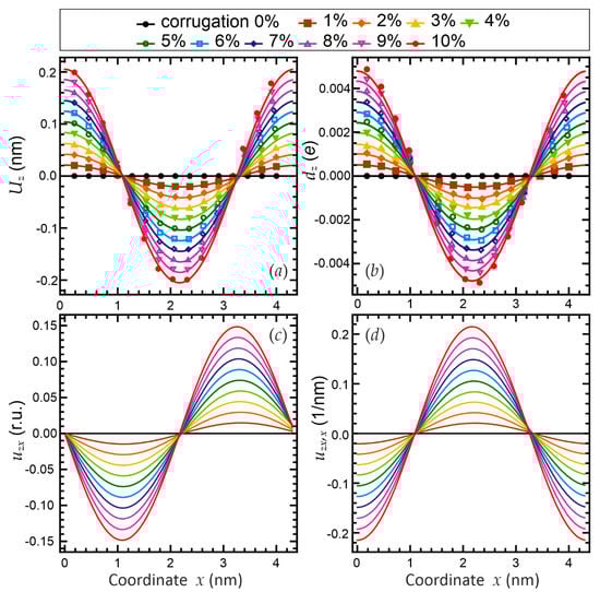 The linear component of the projection of the offset on the x-axis (shown in Figure 6a) is explained by the conservation of the total length of the unit cell, and the projection of the length decreases in the x-direction. The presence of a harmonic component is explained by the fact that atoms located exactly on the top and bottom of the corrugation profile are exposed to electrostatic forces only in the z-direction and remain in place in the x-direction (excluding the linear shift). In addition, those atoms that are in places, where there is a change in the bend of corrugation, do not have a shift in either in the y-direction or in the x-direction (excluding the linear shift). All other atoms change their position under the action of electrostatic and elastic forces in order to achieve equilibrium. Based on the amplitude of the dipole moment (shown in Figure 6b), we can conclude that the deformation of the unit cell in x-direction is negligible, and the presence of the dipole moment in the absence of deformation is explained by the fact that the calculated dipole moment has the third order symmetry axis and, accordingly, is not symmetric in the x-direction in the Cartesian coordinate frame.