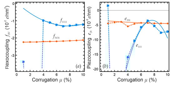 It appears that the components of effective flexoelectric and piezoelectric couplings can be described by parabolic dependences of the corrugation. In particular, the components and weakly depend on the corrugation magnitude and slightly change with the corrugation around an almost constant value. The components and have an extremum at the corrugation 7% and reach unreasonably high absolute values at small corrugations , which are related with the fitting error of the dipole moment projection.