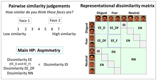 Figure 1. Graphical representation of the task structures, conditions of interest and key hypotheses. During the task, participants rated the similarity among all the possible combinations of 20 faces (5 disgust, 5 fear, 10 neutral) on a 7-point scale (1 = low similarity, 7 = high similarity). The similarity ratings were standardized, transformed into dissimilarity measures (correlational distance) and entered in a 20 × 20 representational dissimilarity matrix (RDM). In the RDM, the rows and the columns represented the stimuli (disgust: 1 to 5; fear: 6 to 10; neutral: 11 to 20), and each cell a correlational distance between faces in each pair. In the RDM, the violet squares represent the dissimilarity within emotional pictures (EE), calculated by averaging the dissimilarity within disgusted (EE_D) and fearful (EE_F) faces; EE_DF is the dissimilarity between disgusted and fearful faces, and NN the dissimilarity within neutral faces; ID, depicted in grey colour, indicates the dissimilarity between emotional and neutral faces, with the same identity, and EN the dissimilarity between emotional and neutral faces, with different identities. We expected an asymmetric effect of emotional expression and identity on similarity judgements, resulting in higher similarity (lower dissimilarity) in EE, EE_DF and NN compared to ID.