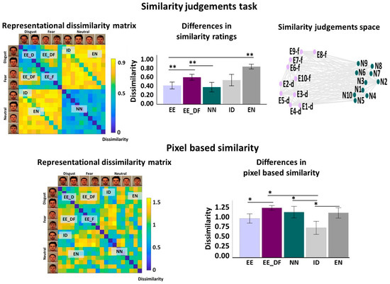 Figure 2. Top panel. Similarity Judgements task.Left panel: Representational Dissimilarity Matrix (RDM) of the similarity ratings of 20 faces (5 disgust, 5 fear, 10 neutral), averaged across participants. It is symmetric about a diagonal of zeros, the rows and the columns represent the stimuli, and each cell the dissimilarity (measured as correlational distance: 1—standardized similarity ratings) between stimuli within each specific pair. Yellow colours denote high dissimilarity, blue colours low dissimilarity. Centre: differences in dissimilarity (measured as correlational distance) among conditions during the similarity judgements task: average dissimilarity within emotional faces (averaged across disgusted and fearful faces) (EE), between emotional faces (EE_DF), within neutral faces (NN), between emotional and neutral faces of the same identity (ID), and between emotional and neutral faces (with different identities) (EN). Right bottom panel: Multidimensional Scaling (MDS) plot of the 20 faces in a bidimensional space. Stimuli from E1_d to E5_d represented 5 disgusted faces, from E6_f to E10_f 5 fearful faces, and from N1 to N10 10 neutral faces. Pixel-based similarity. Left bottom panel: Representational Dissimilarity Matrix (RDM) of the visual similarity of 20 faces (5 disgust, 5 fear, 10 neutral). It is symmetric about a diagonal of zeros, the rows and the columns represent the stimuli, and each cell the correlational distance between stimuli within each specific pair. Yellow colours denote high dissimilarity, blue colours low dissimilarity. Right bottom panel: differences in visual similarity (measured as correlational distance) among conditions. Error bars represent ± 2 SEM; * pFWE < 0.05; ** pFWE < 0.001. Abbreviations: E, Emotional; f, fearful faces; d, disgusted faces; N, neutral faces.