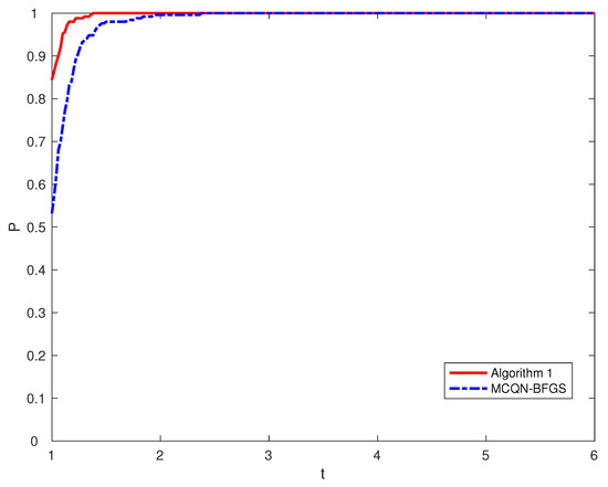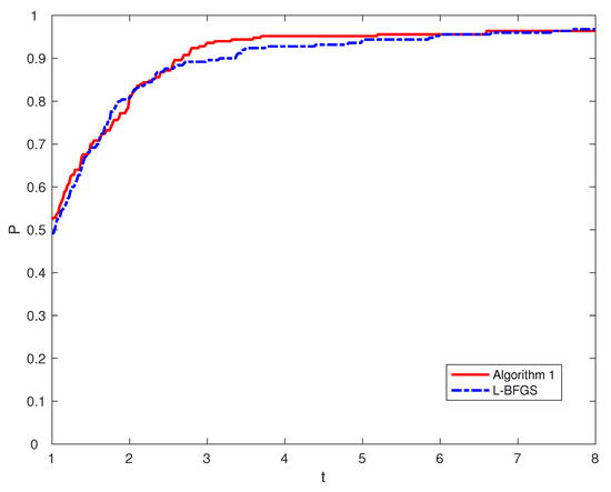 Figure 1 evaluates the number of iterations of and the MCQN update with BFGS method by using performance profiles. It can be seen that the top curve corresponds to Algorithm 1, which shows that Algorithm 1 had better performance than the MCQN update with BFGS method. Additionally, Figure 2 demonstrates that Algorithm 1 had better performance than the limited-memory BFGS method.