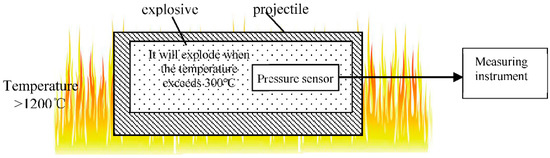The schematic diagram of ammunition thermal safety detection is shown in Figure 1. Due to the particularity of the measured medium and the strong coupling of various physical sites, such as field, temperature field and vibration field, common electrical, ultrasonic and electromagnetic pressure sensing detection technologies, cannot effectively meet the requirements of pressure detection. For the detection of solid pressure, Fiber Bragg grating (FBG) pressure sensing technologies can overcome the disadvantages of conventional pressure sensors such as poor stability, poor moisture resistance, and susceptibility to electromagnetic interference in harsh environments; at the same time, the grating sensor is a passive device, which does not need on-site power supplies. As an important basis to reflect the working state, fault diagnosis and the evaluation of complex detection systems, solid internal pressure has always been the key parameter of various detection systems [1]. Compared with the traditional electrical or electromagnetic pressure sensors, Fiber Bragg grating (FBG) pressure sensors have unique advantages in sensing medium and signal transmissions, such as corrosion resistance, safety and explosion-proof, signal confidentiality, anti-electromagnetic interference, long signal-transmission distance, strong multiplexing ability, and so forth [2,3,4]. In particular, the advantages of long transmission distance make the signal-gratings available to be arranged in different positions of the fiber, which provides convenient conditions for the realization of the multi-point quasi-distributed detection of the internal pressure for the detection system, and has broad application prospects in monitoring and fault diagnosis fields of system conditions [5,6,7]. The use of fiber grating pressure sensing technologies for solid pressure detections can overcome the shortcomings of poor stability, poor moisture-proof performance as well as vulnerability to electromagnetic interference in harsh environments. At the same time, the grating sensor is a passive device, which does not need on-site power supply, which has unique advantages for long-term distributed monitoring (especially in the harsh, flammable and explosive detection environment, electromagnetic interference and strong radiation), and which is increasingly used in solid pressure detections [8,9].