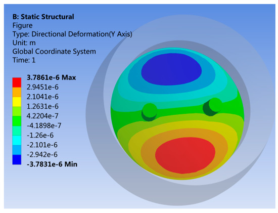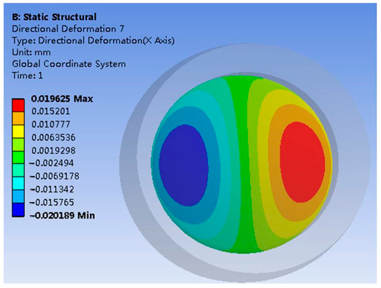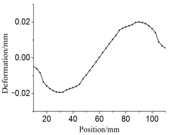 The software of ANSYS is applied to exert a pressure of 50 MP on the cavity model. An X-axis direction deformation cloud diagram depicting the inside of the compression diaphragm is shown in Figure 7. It shows that the largest deformation of the diaphragm (red and blue) occurs on the X-axis. On the inner plane of the diaphragm, the straight line where the X-axis is located is taken for path simulation, and the deformation data of points on the path are read for drawing a curve, as is shown in Figure 8.