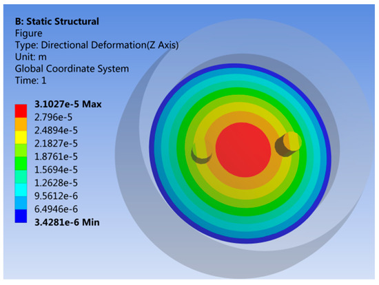 Figure 4, Figure 5 and Figure 6 show the deformation cloud diagram inside the model when 50 MPa pressure is applied to the model. Figure 4 and Figure 5 show the deformation distribution of each point inside the structure in X and Y directions, respectively. Figure 6 shows the deformation distribution of each point inside the structure in the Z axis direction. As can be seen from Figure 4, the deformation of the two fixed columns in the X direction is the largest and the size is close to the opposite direction. However, as can be seen from Figure 5, the deformation of the two fixed columns in the Y direction is of the same color, that is, there is little difference in deformation. In Figure 6, the deformation colors in the Z direction are symmetrically distributed with the center of the circle as the center. As long as the fixed column is symmetrically set with the center of the circle as the center, the center points of the two fixed columns have the same color, that is, there is no relative deformation. The straight line where the two fixed columns are taken as the path, and the deformation of the center positions of the two fixed columns in X, Y and Z directions is extracted, as shown in Table 1.
