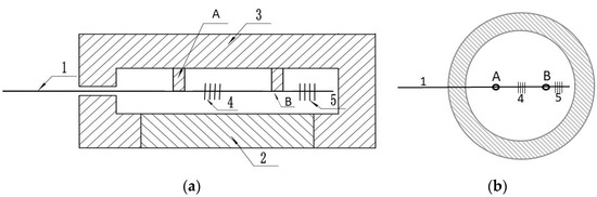 The internal structure view of the sensor: (a) Cross-sectional view; (b) top view. (1) Optical fiber; (2) Stainless steel cover; (3) Pressure-bearing diaphragm; (4) Pressure-sensitive grating FBG1; (5) Temperature compensated grating FBG2; (A,B). Fixed column.