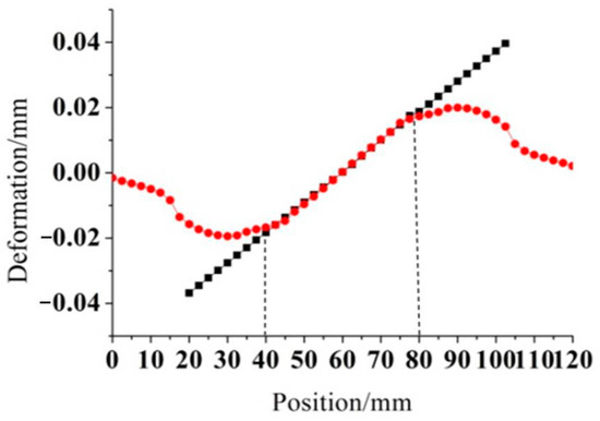 However, if the distance between the fixed columns is too large, the strain distribution on the grating will be uneven, which will affect the pressure detection accuracy of the sensor in the temperature changing environment. By carefully observing the location-deformation curve, it can be found that the curve is near the peak value and the collected data points are dense. Since the data collection points collect deformation data at equal intervals, the slope of change between the position near the peak value and the deformation data becomes smaller. In order to comprehensively consider the purpose of increasing the pressure sensitivity of the sensor and reducing the temperature sensitivity of the grating, the intersection point of the line with the highest slope of the position-deformation curve and the curve was used as the placing point of the fixed column. It can be seen that the two fixed columns are 40 mm apart and symmetric about the origin. It is shown in Figure 10.
