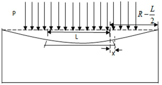In Figure 11, L is the distance between fixed fiber columns, and is the radius of elastic diaphragm. It is known that the distance between the fixed columns L = 40 mm, the height of the fixed column m = 10 mm, and the radius of the diaphragm is R = 120 mm. As shown in Figure 11, concave deformation of the compressed diaphragm occurs after compression, and then the deformation deflection of the diaphragm at the fixed column is .