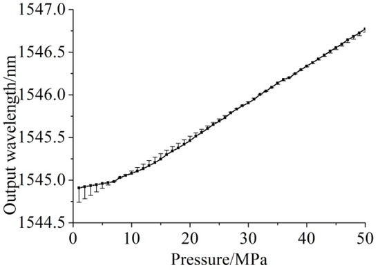 The change of the central wavelength of the grating in the process of pressure and depressurization was observed by computer. The experiment adopts step-by-step pressurization, starting from 1 MPa, each time the pressurization range is 1 MPa, and then gradually increased to 50 MPa. In the step-down process, start from 50 Mpa and step down 1 Mpa each time until 0 Mpa. A round trip of pressurization and depressurization is regarded as one cycle, and three cycles are carried out continuously. Take the average output value of each pressure point as the measured value of that point. The collected data were analyzed according to the verification regulations of the pressure sensor, and the relationship between the output wavelength of the sensor, the pressure and the Error of detection was obtained, as shown in Figure 13 and Figure 14: the pressure boost process was y = 0.0406x + 1544.7, and . The depressurization process was Y = 0.0435x + 1544.6, and .
