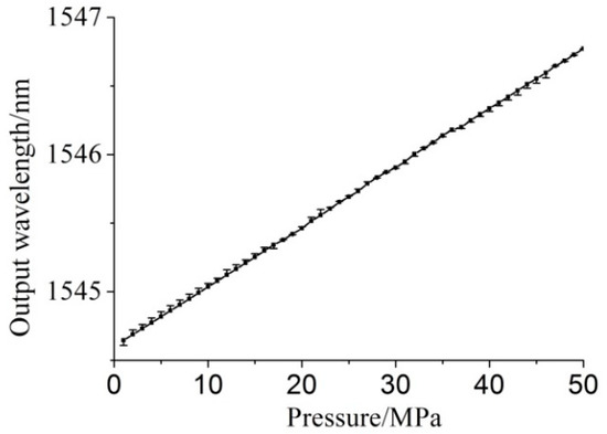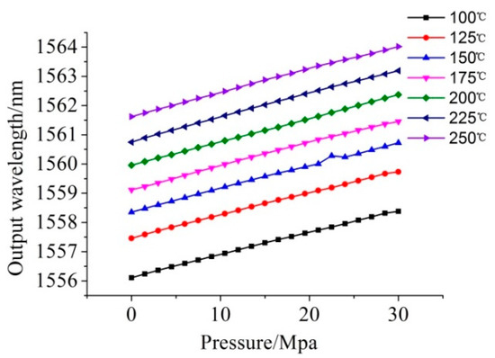 The is not a constant value. It is necessary to substitute the detected wavelength of the temperature-compensating grating into Formula (10) and the calculated the experimental temperature . Then it can get the pressure sensitivity of the grating sensor from Figure 19, at that temperature. Finally, the pressure to be measured would be obtained by substituting and into Formula (11).
