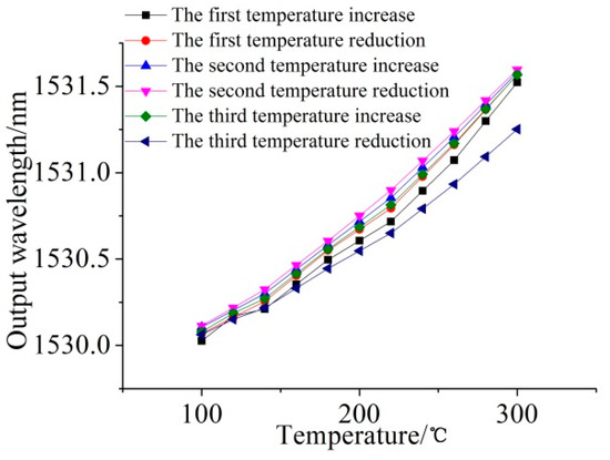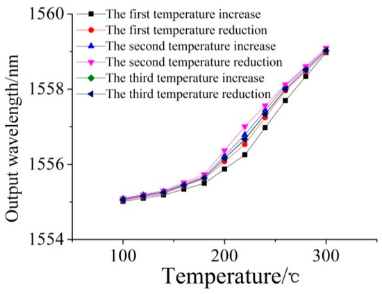 Put the sensor into the thermostat, and test the method of gradual heating of the sensor, starting from 100 °C, each temperature rise is 20 °C, and then gradually increase the temperature to 300 °C. Then, the sensor is cooled. In the cooling process, it starts from 300 °C and drops 20 °C each time until 100 °C. After holding for 4 h at each temperature point, the output of the pressure-sensitive grating FBG1 and the temperature-compensated grating FBG2 of the sensor were recorded every 10 s, and the average value was taken as the output value of the point after 15 times of recording. The above experiment cycle was carried out three times. Grating output data were recorded and temperature-output wavelength diagrams were drawn, as shown in Figure 15 and Figure 16.