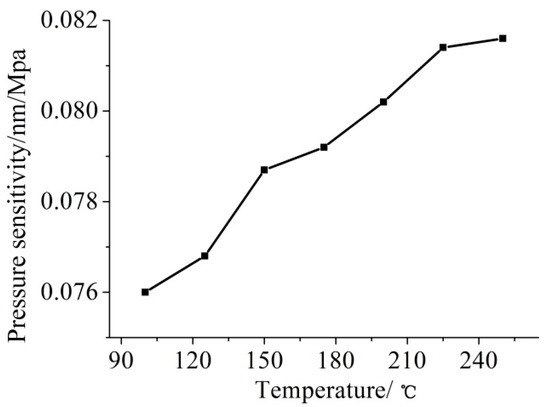 The thermostat was set from 100 °C to 250 °C at an interval of 25 °C. After holding for 4 h at each temperature point to ensure that the output of the pressure-sensitive grating and the temperature complement grating were stable, the pressure and pressure reduction experiments were carried out on the sensor through a pneumatic pump. Starting from 0 MPa, the step length of 1.5 MPa is gradually increased to 30 MPa, and then the step length of 1.5 MPa is gradually decreased to 0 MPa. This cycle was repeated three times to record the output wavelength of the pressure-sensitive grating at different pressures at each temperature point for data processing, as shown in Figure 18. On this basis, the pressure sensitivity of the FBG sensor is calculated at each experimental temperature, and the curve is shown in Figure 19. As can be seen from Figure 19, the pressure sensitivity of the sensor increases with the increase of the ambient temperature detected, but its changing trend presents a nonlinear change.