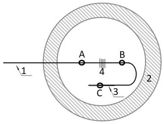 Optimized internal structure of the sensor. (1) Optical fiber (2) Sensor housing (3) Copper capillary (4) Pressure sensitive grating (A,B,C). Fixed column