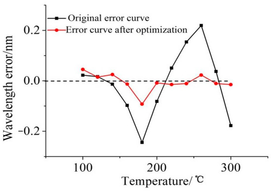 As can be seen in Figure 20, the sensor is composed of stainless steel shell, optical fiber, pressure-sensitive grating, temperature compensating grating, three fixed column ABC and copper capillary. Among the three fixed columns ABC, AB is used to fix the pressure-sensitive grating, and the additional fixed column C is used to fix the copper capillary that encapsulates the temperature-compensated grating. As can be seen from Figure 18, through structural adjustment, the two gratings are at the same height and the same longitudinal coordinate, which not only ensures that the two gratings are strictly in the same temperature field, but also realizes the sensitization package of the temperature-compensated gratings. In addition, this structure can keep the temperature-compensated grating from straining when the sensor is subjected to an external force. It does not affect the pressure conversion mechanism of the sensor. The temperature experiment of the modified sensor was conducted again. The temperature sensitivity of the temperature compensating grating is three times higher than that of the grating before packaging, which can improve the temperature compensation effect of the pressure measuring grating. Comparison of error curves before and after structural adjustment is shown in Figure 21.