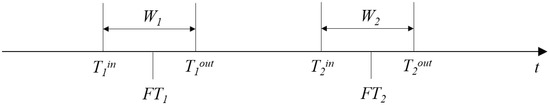 Figure 2. Time window diagram.For example, suppose that we have a number of terrestrial towers that act as relay nodes for data transmission. However, these towers are located in a very harsh geographical environment with frequent thunderstorms, rain and snow. These factors will make it impossible to transmit data with them at all times, but only during specific time windows when the weather conditions are met. If during a schedule, the edge device cannot transmit with any relay node, tasks will be stored and try to execute in the next schedule. - Resource constraintEach relay node has limited resources, including CPU, memory and bandwidth. The large amount of data generated by edge devices needs to be transmitted. This process requires the CPU, memory and bandwidth of relay nodes. If these resources are not sufficient, then data transfer will be delayed or even blocked, and it is also difficult to guarantee real-time availability. Therefore, it is necessary to ensure that the relay node has sufficient resources for data transmission. The data transmissions between terminals and relay nodes are competitive; some tasks may not be completed due to insufficient resources by competition. These tasks are stored and participate in the next scheduling. The formalization of the constraint in Equation (5) is as follows: