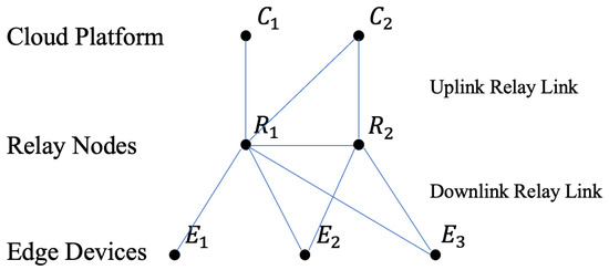 Node settings: We have two edge devices () and five relay nodes () and four cloud platform receiving devices (). The transmission rate is 900 Mbps, determined by the bandwidth. The operating time of the nodes is from 00:00:00 to 23:59:59. The valid time window between and is specified by default according to the available data and other information in Table 2. The time window between the remaining nodes can be obtained in the same way.