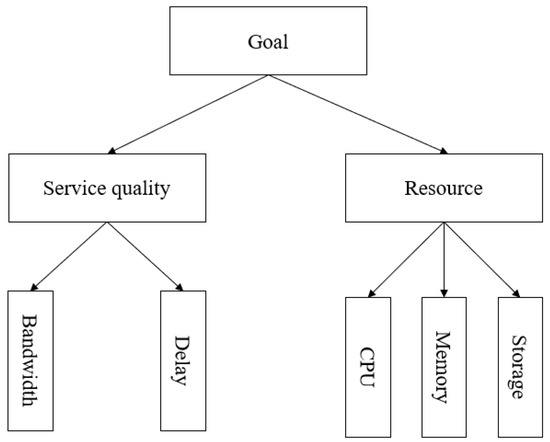 The analytic hierarchy diagram is shown as Figure 5. In the method, the multiple attributes of node state are divided into different levels according to the dependency relationship. The lower level is the decomposition of the higher-level attributes. For example, the service quality can be decomposed into two sub-attributes of bandwidth and delay. The sub-attributes in the diagram represent the real-time node state. We use the states of these nodes combined with the decision matrix to evaluate the node state and segment the data. Our optimization goal is not these properties, but the minimum transmission time. These properties are considered because they have an impact on that goal.