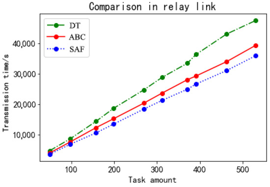 We compare three methods in the downlink relay link, including DT, SAF and ABC. The result is shown as Figure 6. The x-axis shows the task amount. The y-axis shows the time cost by the transmission. The method with the lower cost time performs better for the same task amount. It can be seen from the figure that the DT method is worst, and the ABC method has the second-best effect, and the SAF method is the best, which could transmit all data more efficiently. The result of the DT method may be caused by resource constraints.