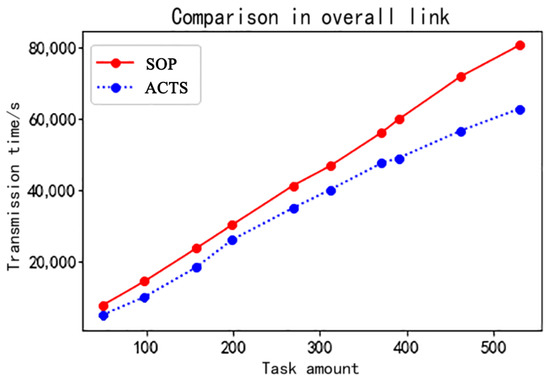 We compare two methods in the overall link, including SOP and ACTS. The result is shown in Figure 7. The x-axis shows the task amount. The y-axis shows the time cost by the transmission. The performance is evaluated in the same way as for the downlink. The method with the lower cost time performs better for the same task amount. It can be seen from the figure that compared with the traditional step-by-step optimization SOP for different numbers of scheduling tasks, the global optimization ACTS can transmit all data more efficiently.
