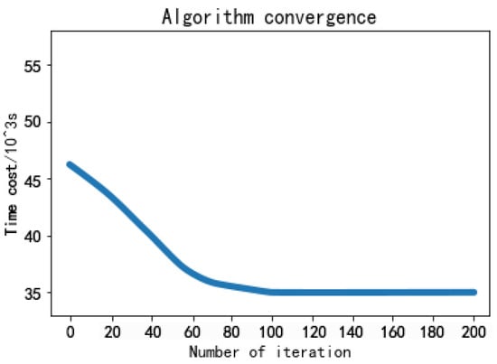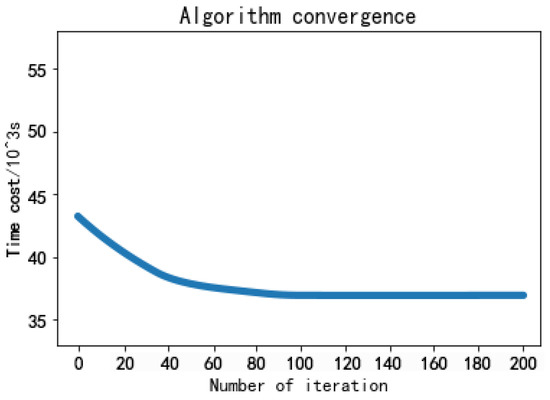 - Output the best path for each generation, and the optimal solution is obtained after several iterations. The overall transmission time is our optimization metric, and the solution with the smallest transmission time is optimal. The overall transmission time can be calculated by Equation (7). The specific calculation procedure is also provided in Algorithm Section 5.1.