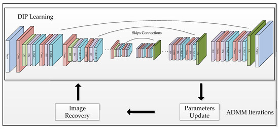 Despite great achievements, the above deep-learning-based methods rely heavily on a large number of clean samples and a significant amount of training time. To address this issue, unsupervised deep-learning-based methods [29,30] can achieve precise recovery without clean data. While Stein’s unbiased risk estimate (SURE) is used to train a deep neural network in an unsupervised fashion in [29], generative adversarial networks (GANs) trained with noisy images are adopted to yield noise-free images in [30]. Nevertheless, they still require training samples, even for noisy images. Noise2Noise [31] and deep image prior (DIP) [32] are the two most representative algorithms that only demand a small amount of training samples. In contrast to the Noise2Noise method, which demands two independent observations of the corrupted scene, the DIP method only requires the current noisy image and thus behaves more intelligently. In order to improve the performance of DIP, researchers have proposed to modify its objective function by either using SURE [33] or adding the TV sparse term [34] for more stable reconstruction. In addition, integrating DIP into optimization-based methods, such as the alternating direction method of multipliers (ADMM) framework, has been proven to be an effective mean of improvement in [35,36]. While the TV sparse term is utilized by ADMM-DIPTV [35], leading to an l2 norm proximity operator being necessary to complete a step of ADMM, the regularization by denoising (RED) technique that turns an existing denoiser into a regularizer has been merged with DIP by DeepRED in [36]. In general, the performance of unsupervised deep-learning-based methods is worse than that of supervised methods.
