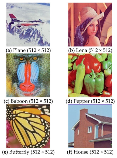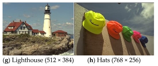 Figure 2 provides eight test natural images used in our experiments with various sizes. We generated noisy measurements by adding varying amounts of additive white Gaussian noise to the test images. The range of the standard deviation of Gaussian noise includes 25, 30, 35, 40, 50, 60, and 75. Then, we applied the comparison methods to execute denoising. The peak signal-to-noise ratio (PSNR) and structural similarity (SSIM) [42,43], shown in Equation (23) and Equation (24):