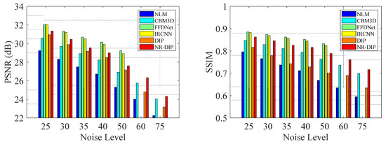 In order to show the comparison results more vividly, Figure 3 provides the average PSNR and SSIM values of the comparisons between the reconstructions by different methods. The order of performance in terms of PSNR from good to bad is FFDNet, IRCNN, NR-DIP, DIP, CBM3D, and NLM, while the in terms of SSIM it is FFDNet, IRCNN, NR-DIP, CBM3D, DIP, and NLM. The average PSNR results of NLM, CBM3D, FFDNet, IRCNN, DIP, NR-DIP are 27.4 dB, 28.9 dB, 30.7 dB, 30.5 dB, 29.1 dB, and 29.6 dB for the noise standard deviation ranging from 25 to 50, respectively, while the average PSNR results of NLM, CBM3D, DIP, and NR-DIP are 23.1 dB, 24.9 dB, 24.0 dB, and 25.3 dB for the noise standard deviation of 60 and 75, respectively. For a higher noise level, the difference between algorithms increases, but the order remains unchanged. Note that the NR-DIP method is better than the original DIP, NLM, and CBM3D methods, and has verified the effectiveness of the proposed combination scheme. Although the results of NR-DIP still fall short when compared to the supervised state-of-the-art methods, NR-DIP has been shown to be quite effective, and demonstrated successfully the problem of image denoising.