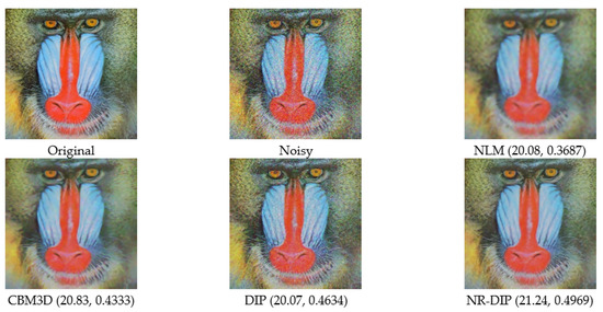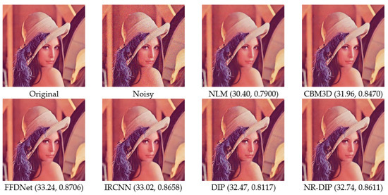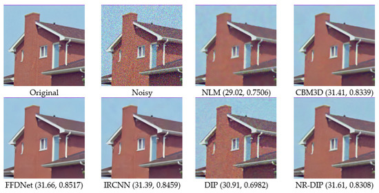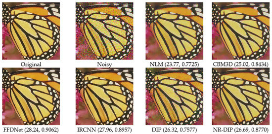 are used to quantitatively evaluate the qualities of the reconstruction results. In Equation (23), m and n denote the image size. In Equation (24), , , , , and are the average intensities, standard deviations, and cross-covariance of a clean image, y, and an evaluated image, x, respectively. For fair comparisons, we have downloaded codes from the websites of the authors, adopting the default experiment settings. The main parameters of the proposed NR-DIP algorithm include: (1) the weights of the linear combination, i.e., and in Equation (16); (2) the parameter of ADMM, , in Equation (14); and (3) the learning rate of training is set to 0.008. Due to the long running time of BM3D, we apply it once every 100 iterations of the ADMM to save time. The DIP-based methods were implemented in the Python language with a PyTorch framework and run on an NVIDIA GTX 3090 GPU. NLM and CBM3D were implemented in the Python language, but were run without a GPU. FFDNet and IRCNN were implemented in the MATLAB language and also run without GPU because they are already fast. The experimental results including objective quality, subjective quality, and runtime are present.