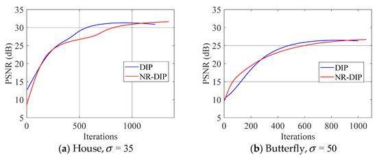 In order to evaluate the running time and convergence of the proposed method, we also traced the runtime and PSNR of each iteration for the original DIP method as well as our method. The results are illustrated in Figure 8, which presents the iteration number vs. PSNR curves of the House and Butterfly images, respectively. In particular, the performance curves in Figure 8 correspond to the experiment in Figure 5 and Figure 6. In Figure 8, the NR-DIP method achieves the better performance in terms of PSNR and iterations than the original DIP after around 1000 iterations. These curves validate that the proposed method NR-DIP can converge to a good denoised result in a reasonable number of iterations.