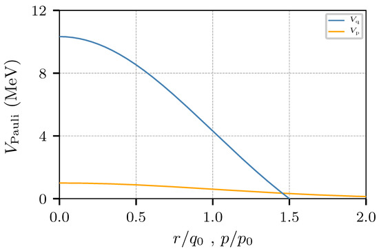 The upper blue line corresponds to the spatial factor of the Pauli potential, , plotted as a function of r in units of fm; notice the truncation at fm. The lower orange curve is the exponential reduction imposed by the momentum dependent factor, , as it goes from to .