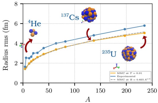 Radius of nuclei at the ground state (T = 0.01 MeV). The bottom orange dots corresponds to the MMC simulation. The data points in blue correspond to commonly accepted experimental values. The dashed curve in gray is a least square fit of the MMC data of the type , where c is 0.835.