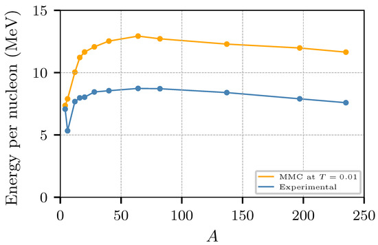 Likewise, Figure 3 shows the binding energy per nucleon obtained for the nuclei of Figure 2. Although the trend follows the same trajectory of the experimental values, the simulated nuclei are about 50% over-bound, close to the results of the Simple Semi-classical Potential of Horowitz and coworkers [33], see Figure 2 in [52] for a comparison with other models.