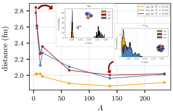 Average distance between the nuclei of Figure 2. The insets show the un-normalized probability of finding a nucleon at a distance d, for the pairs , , and in the nuclei and .
