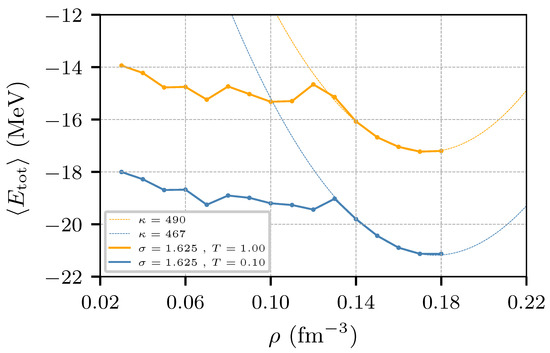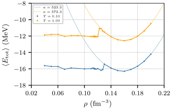 Average energy per nucleon as a function of the density for nuclear matter at and MeV. The systems were constructed with 500 protons and 500 neutrons. The dashed lines correspond to quadratic fittings of the energies in the density range = 0.13–0.18 fm−3. The estimates of the compressibility can be seen in the legend.