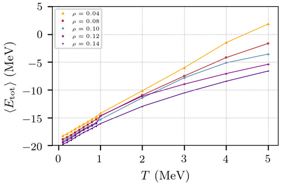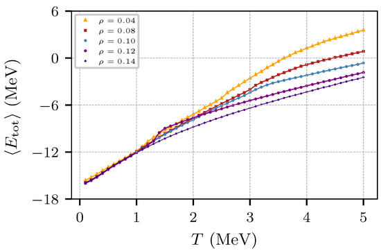 Figure 10 shows the energy per nucleon as a function of the temperature for values of the density between 0.04–0.14 fm−3, for a system with 5832 nucleons with equal numbers of protons and neutrons (with the corresponding spins). Notice that the energy at fm−3 experiences a sharp change around T ≈ 1.5 MeV, denoting a change of phase. It should be remarked that, at a difference from molecular dynamics calculations, MMC calculations do not explore the energy landscape profusely, and arrive at configurations of minimum energy that correspond to meta-stable liquid states which, at slightly lighter densities drop in internal energy corresponding to non-uniform states; these changes appear as sudden drops in the plots at around 0.13 fm−3, and tend to diminish for 0.1 MeV, and are less noticeable in nuclear matter (cf. Figure 5).