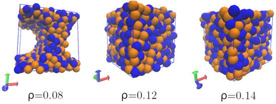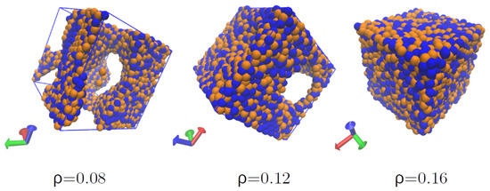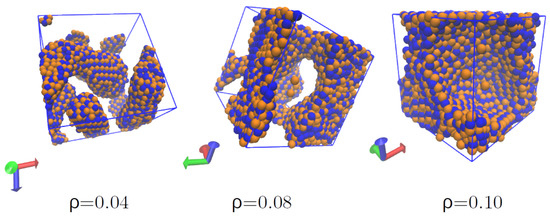 Structures produced in nuclear matter at densities 0.08, 0.12, and 0.16 fm−3 and MeV. Pseudo-pastas form at sub-saturation densities.