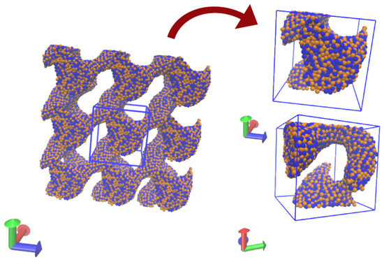 Using the present model, structures of nuclear matter with 1000 nucleons were found at sub-saturation densities and a low temperature ( MeV), see Figure 7. Structures at 0.14 and 0.12 fm−3 depict continuous liquid-like arrangements, while that at 0.08 fm−3 show pasta-like structures. Figure 8 shows the structure obtained with 5832 nucleons, equal number of protons and neutrons, at 0.04 fm−3 and T = 0.8 MeV; the structure on the left shows the simulation cell and its replicas.