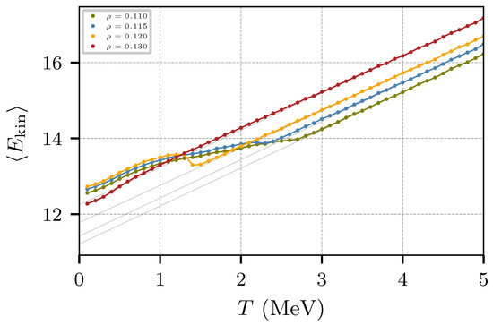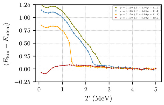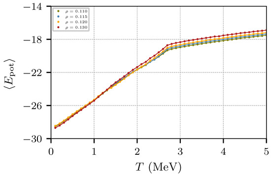 The behavior of E can be examined in terms of the kinetic and potential energies. Figure 11 and Figure 12 show, respectively, the kinetic and potential components of the energy of Figure 10 as a function of the temperature. While the potential energy does not show a significant change at around T ≈ 1.5 MeV, the kinetic energy does show a change in the slope for low densities, especially for ρ = 0.12 fm−3. Figure 11 also shows that the potential energy changes its trend at T ≈ 3 MeV, presumably due to the Pauli potential at low and high momentum transfer.