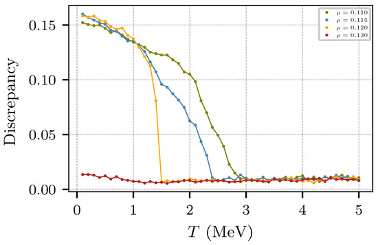 To visualize changes in the internal structure we recur to the Kolmogorov statistic, which computes the discrepancy between the sampled spatial distribution of the nucleons and a uniform distribution. This statistic, plotted in Figure 13, shows changes at MeV for densities 0.11 fm−3 ≲ ρ ≲ 0.12 fm−3, denoting the changes from uniformity to pasta-like structures at low densities, but not at 0.13 fm−3.