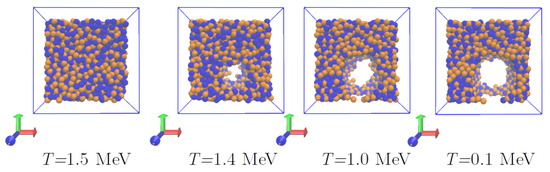 The divergence from uniformity can also be seen in Figure 15, which shows the structures formed in systems with ρ = 0.12 fm−3, with a “bubble” appearing in the simulation cell appearing at MeV.