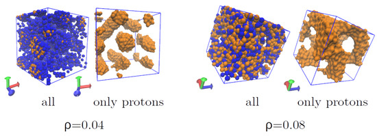 Figure 18 shows two structures of neutron star matter obtained with 1944 protons and 3888 neutrons (), at a temperature of 0.1 MeV and 0.04 and 0.08 fm−3; to clarify the structures, the position of the protons is also presented.