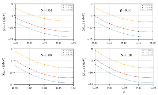 To calculate the symmetry energy it is necessary to know the energy per nucleon at various densities and temperatures, and for various values of the isospin asymmetry, x. Figure 19 shows the behavior of the energy per nucleon as a function of x for temperatures 0.5, 1.0, and 2.0 MeV, and densities 0.04, 0.06, 0.08, and 0.10 fm−3.